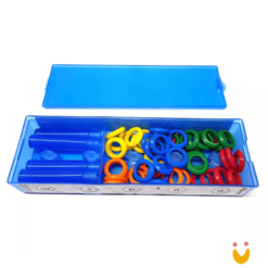 Confeccionado em M.D.F., plástico e madeira – Quadro em M.D.F. com serigrafia atóxica, medindo 30 x 7 x 28 cm, com 4 varetas e 40 argolinhas de P.V.C. rígido coloridas. Embalagem: Película de P.V.C. encolhível.