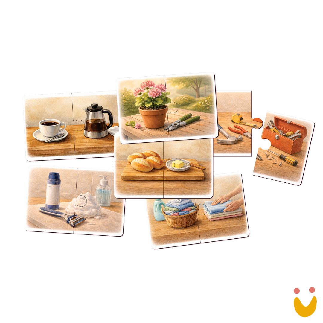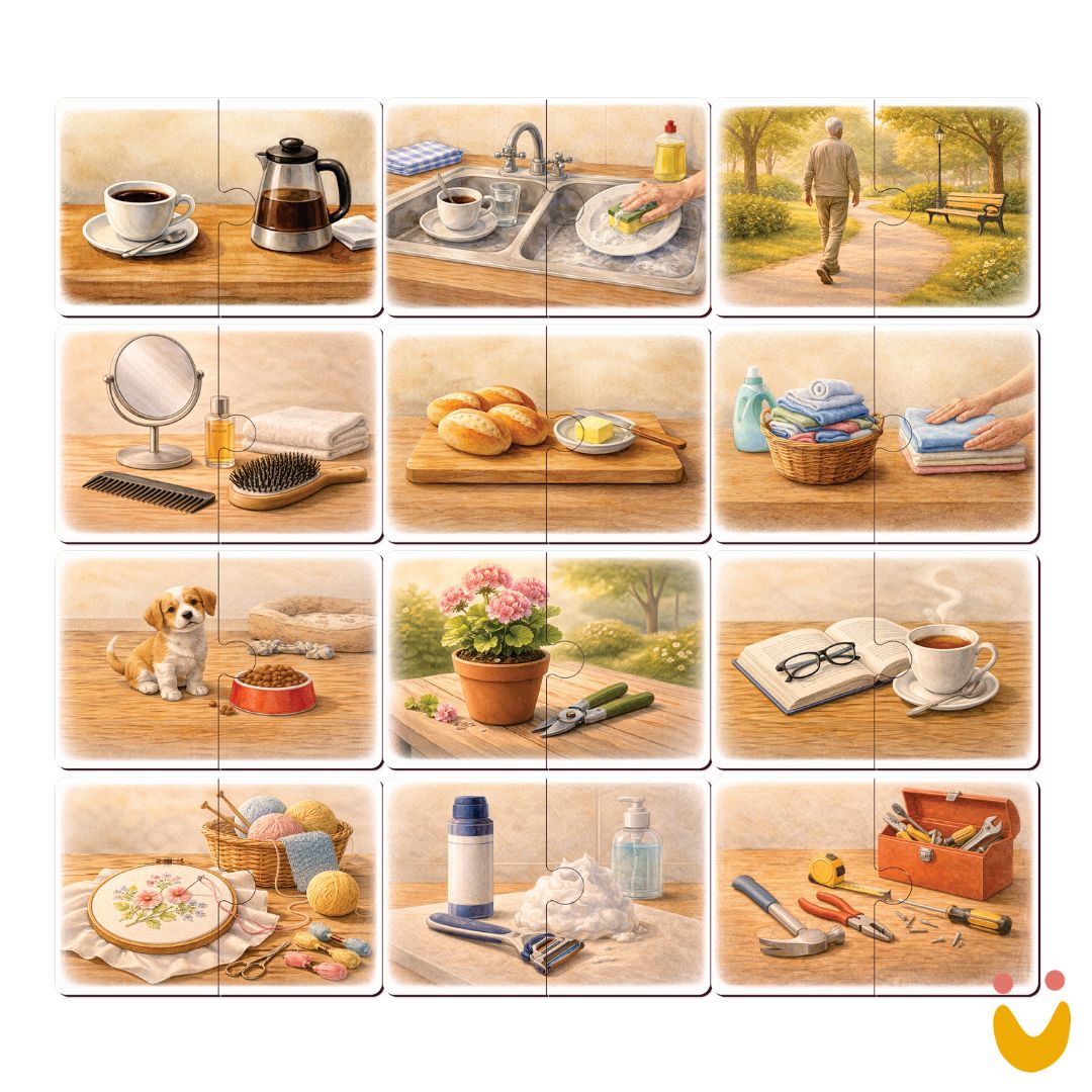 Mais do que atividades, os materiais propõem conexões significativas com o cotidiano: reconhecer objetos, relembrar rotinas, exercitar escolhas e resgatar memórias. Cada proposta foi pensada como um convite acolhedor, que respeita o ritmo individual e incentiva a sensação de capacidade e pertencimento.