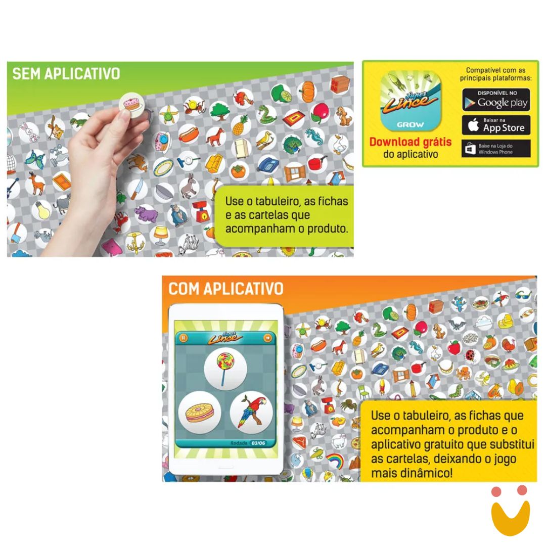 Contém: 1 tabuleiro, 120 fichas, 1 saco plástico, 270 cartelas ilustradas e regra. Download grátis do aplicativo – Compatível com as principais plataformas Windows Phone, Google Play e App Store
