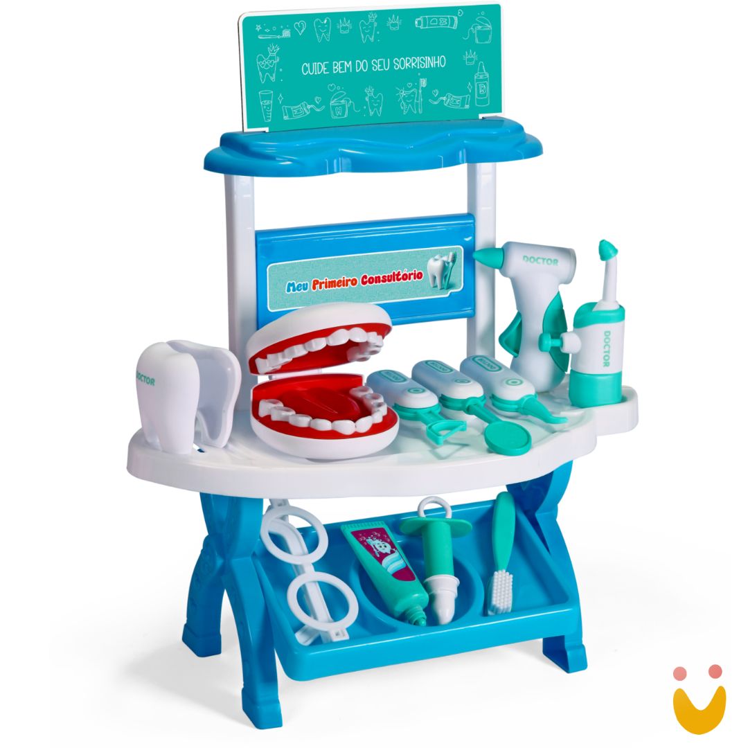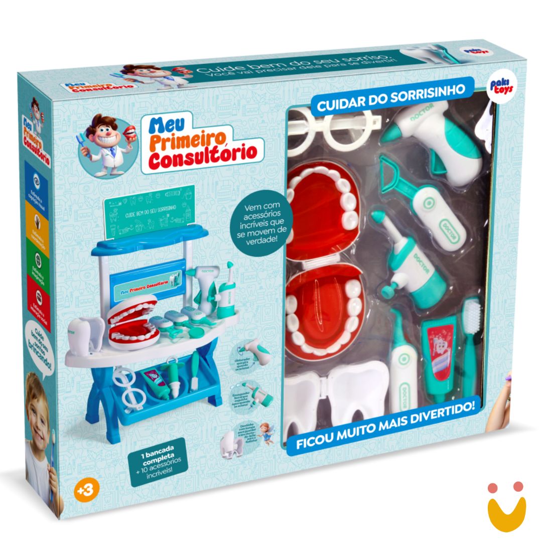 O kit acompanha uma bancada completa e diversos acessórios em plástico, como boca com dentes, escova, pasta, óculos e instrumentos odontológicos, que deixam a brincadeira ainda mais realista e educativa.