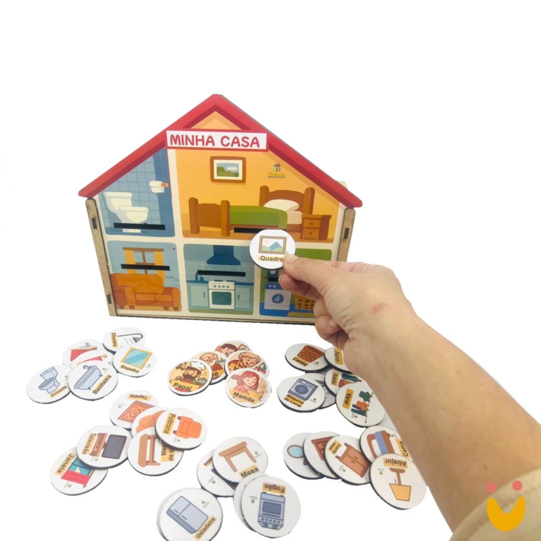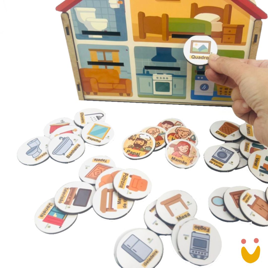 Este Brinquedo Educativo é um recurso lúdico e funcional que estimula a compreensão de conceitos espaciais e a associação lógica. A atividade consiste em uma casinha em MDF na qual a criança deve encaixar 35 fichas ilustradas de móveis e pessoas nos ambientes correspondentes.