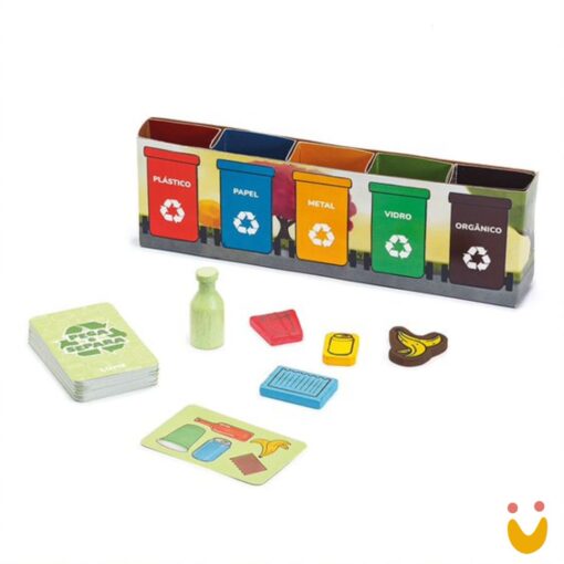 Contém: 5 peças em madeira representando os objetos do lixo ( 1 garrafa de vidro, 1 copo plástico, 1 lata de alumínio, 1 folha de papel e 1 casca de banana), 1 lixeira em papel-cartão com 5 divisórias, 45 cartas e 1 folheto com regras do jogo.