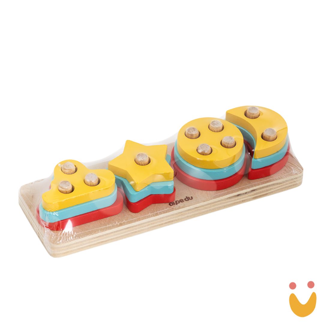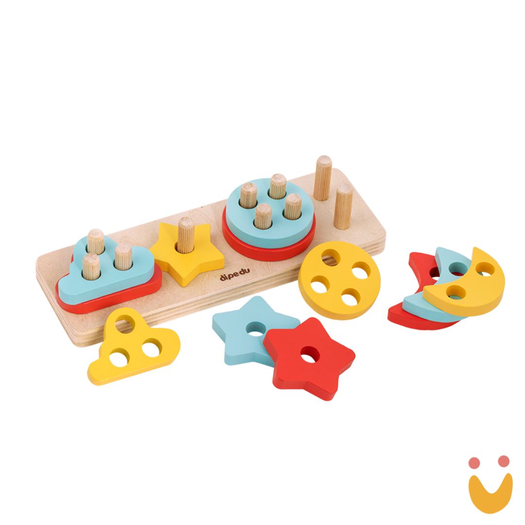 Projetado para ajudar as crianças a explorar o mundo das formas geométricas e das cores, enquanto desenvolvem habilidades motoras e cognitivas essenciais. Este brinquedo consiste em uma prancha de madeira com cinco colunas, cada uma com formas de diferentes cores, que devem ser empilhadas e organizadas corretamente, proporcionando uma experiência de aprendizado rica e envolvente.