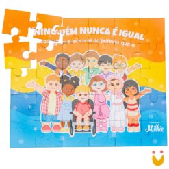 Contém: 60 peças grandes que compõem 8 ilustrações com os personagens da Turminha da Millie fazendo boas ações e Manual com Dicas de Pedagogos para aprimorar a interação e potencializar o aprendizado