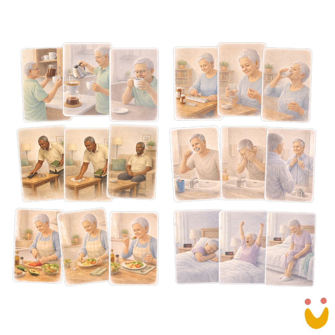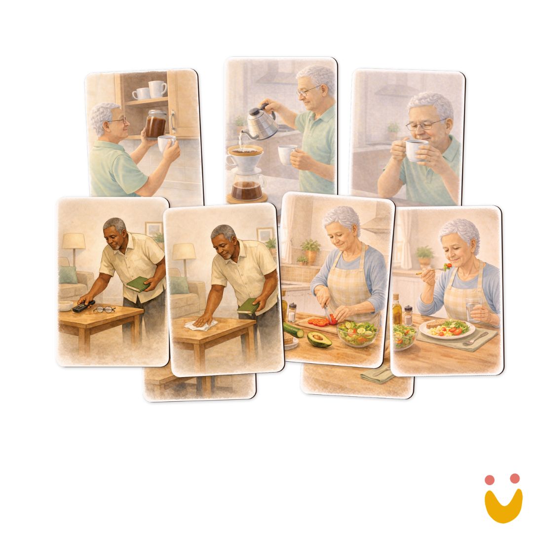 Mais do que atividades, os materiais propõem conexões significativas com o cotidiano: reconhecer objetos, relembrar rotinas, exercitar escolhas e resgatar memórias. Cada proposta foi pensada como um convite acolhedor, que respeita o ritmo individual e incentiva a sensação de capacidade e pertencimento.